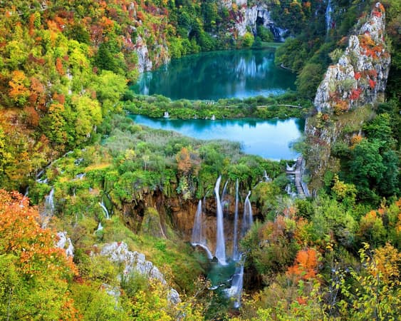 Within the boundaries of this heavily forested national park, 16 crystalline lakes tumble into each other via a series of waterfalls and cascades. The mineral-rich waters carve through the rock, depositing tufa in continually changing formations. Clouds of butterflies drift above the 18km of wooden footbridges and pathways that snake around the edges and across the rumbling water.